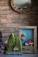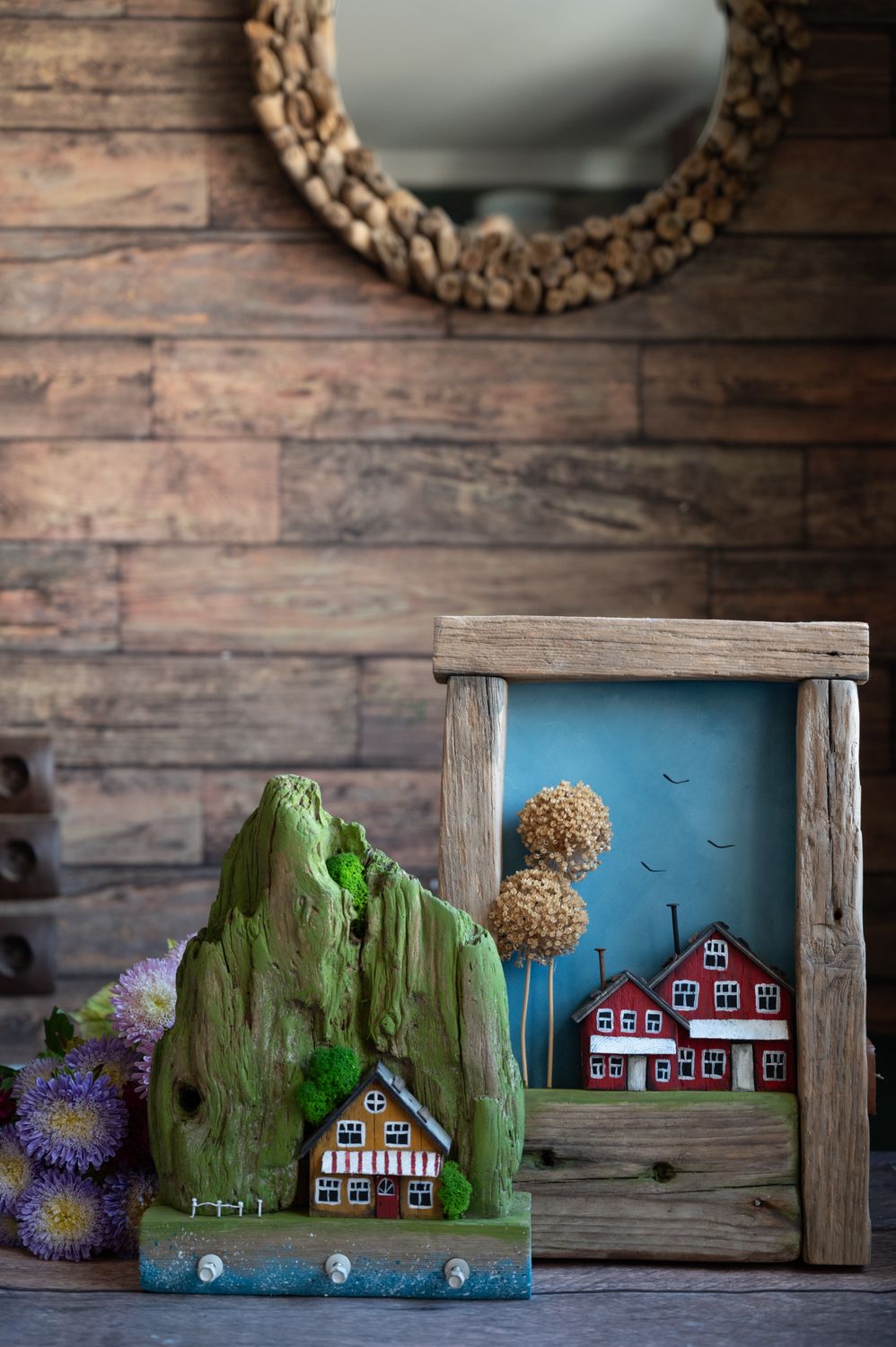 Materials: driftwood, wood, dried flowers, acrylic paints